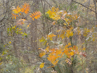 This fall there are changes in the Woods. The usual herd of around a half dozen to a dozen white-tailed deer that normally shelter in the Woods during the hunting season is now down to two. I found their beds yesterday morning walking the trail up to the North Rim. There were two fresh depressions, leaves flattened against the soil, about 3 feet apart, where the two deer had spent the night. The new construction and fencing on the south boundary limits the movement of wildlife in and out of the Woods from the wilder river lands. I saw the first cottontail rabbit I'd seen in the Woods in months, when it burst out of a brush pile at my feet and dashed away uphill into the forest.